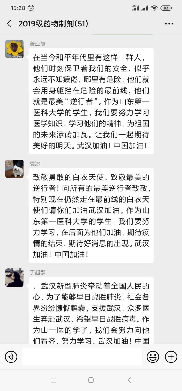 2017级临床药学本科1班的卜佳伟同学说:“医生是人民健康的守护者,在捍卫人民生命健康安全的战争中,医务人员即使有再大压力也不会后退,因为他们心中秉持着从医的信念,这也是每一个医学生要有的信念。我们作为新时代的医学生,一定不负期望,夯实自己,为祖国建设贡献自己的力量。”