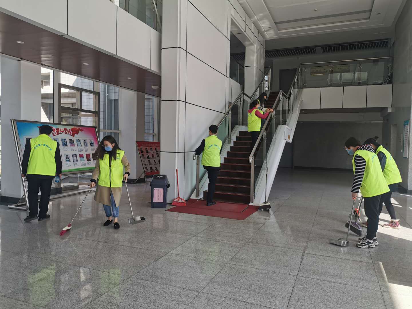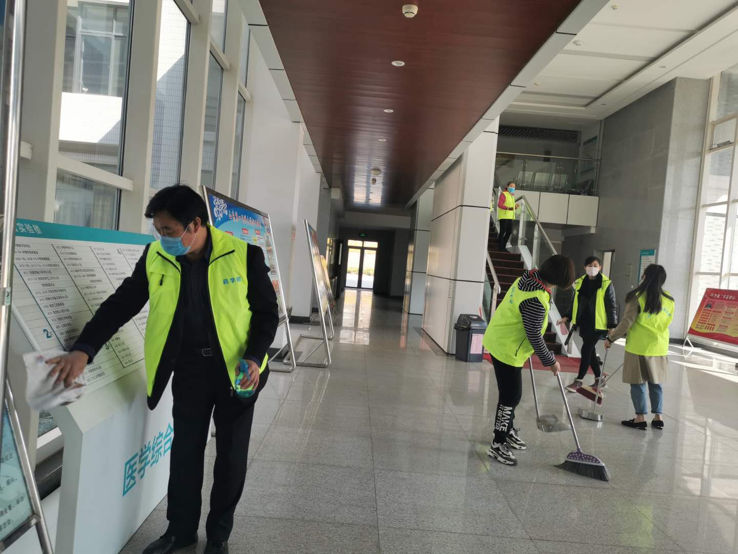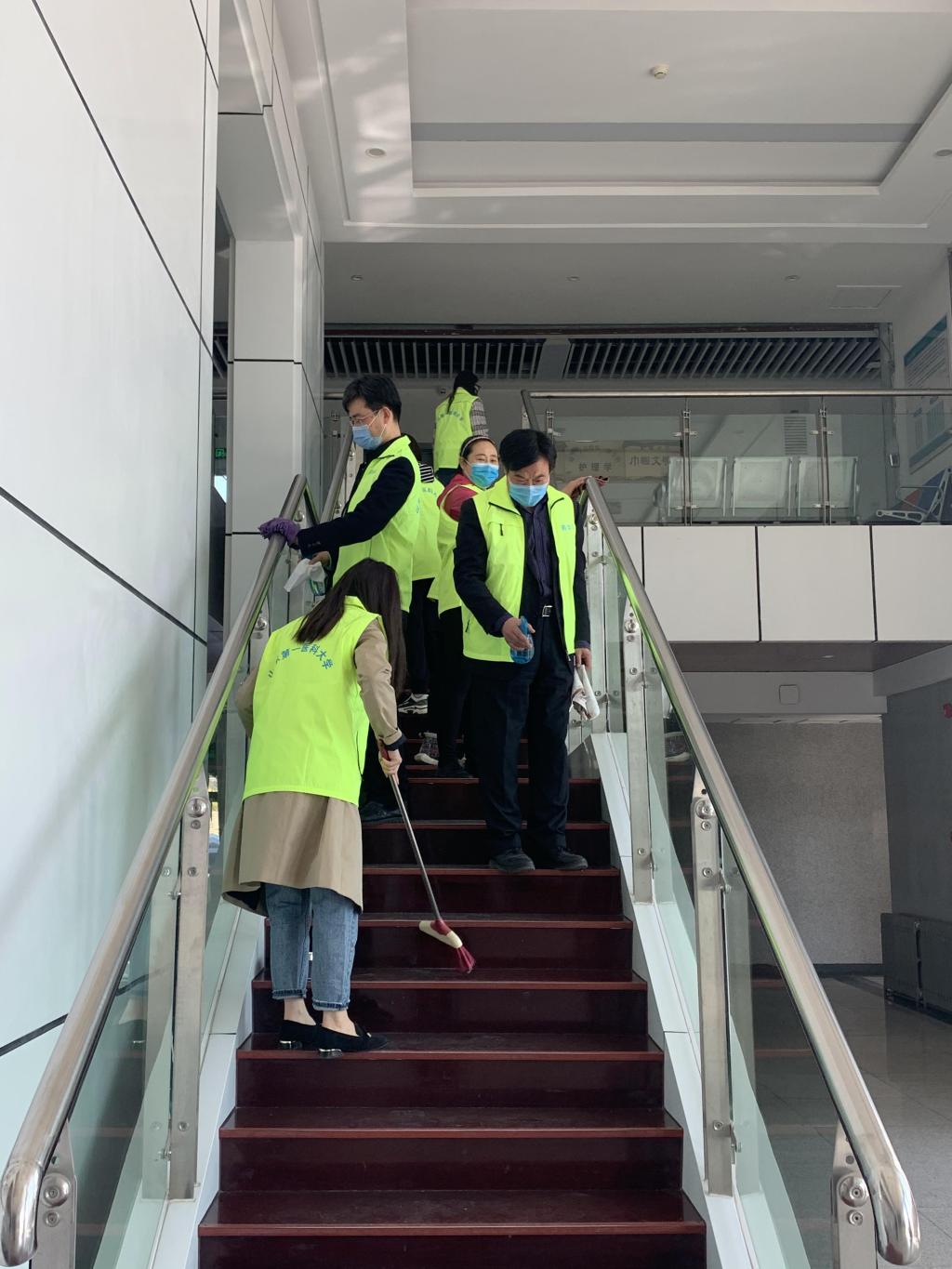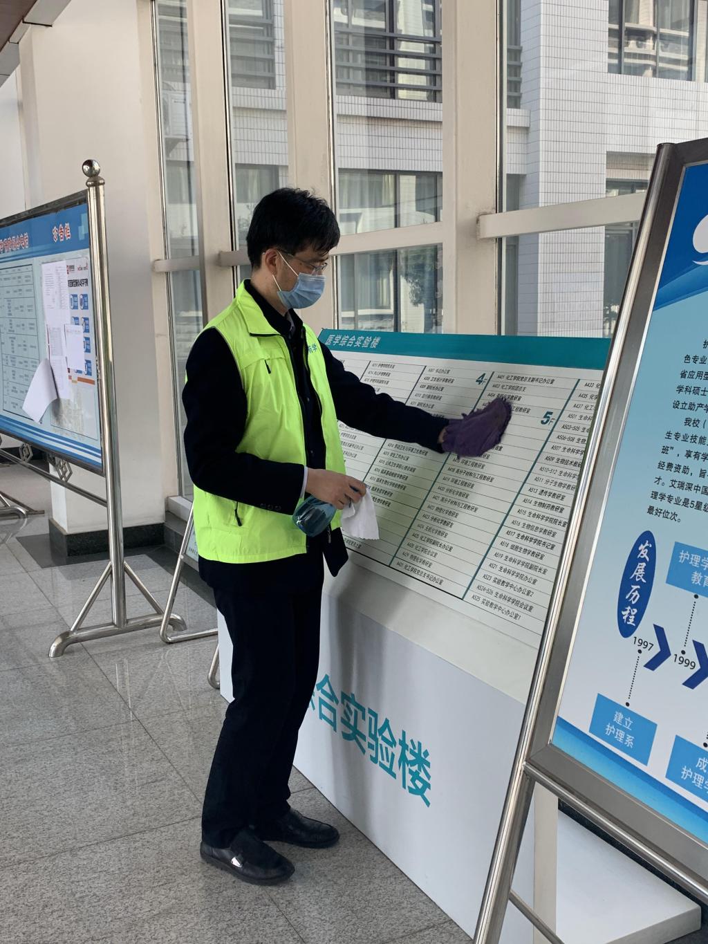 药学院领导班子、具备返岗条件的教工党员们共同参加了此次志愿服务活动。他们分别于综合实验楼大厅、楼梯、大楼周边环卫区、项目现场等重点位置进行了环境消毒、清洁打扫、垃圾清理等工作。