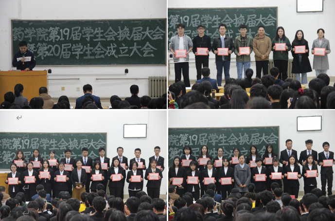首先,团总支乔杰老师宣读药学院第20届学生会常委名单及药学院第19届学生会受表彰同学名单,并由乔峰、彭曼曼、叶彦艳三位老师分别为优秀学生会干部、干事颁发荣誉证书。