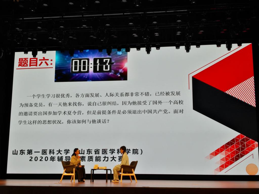 11月20日,药学院全体辅导员在济南主校区参加和观摩了2020年山东第一医科大学辅导员素质能力大赛决赛,决赛部分包括谈心谈话和主题宣讲两大环节,从多个角度展示了辅导员的工作能力与职业素养。药学院辅导员彭曼曼、叶彦艳也进入此次大赛决赛。