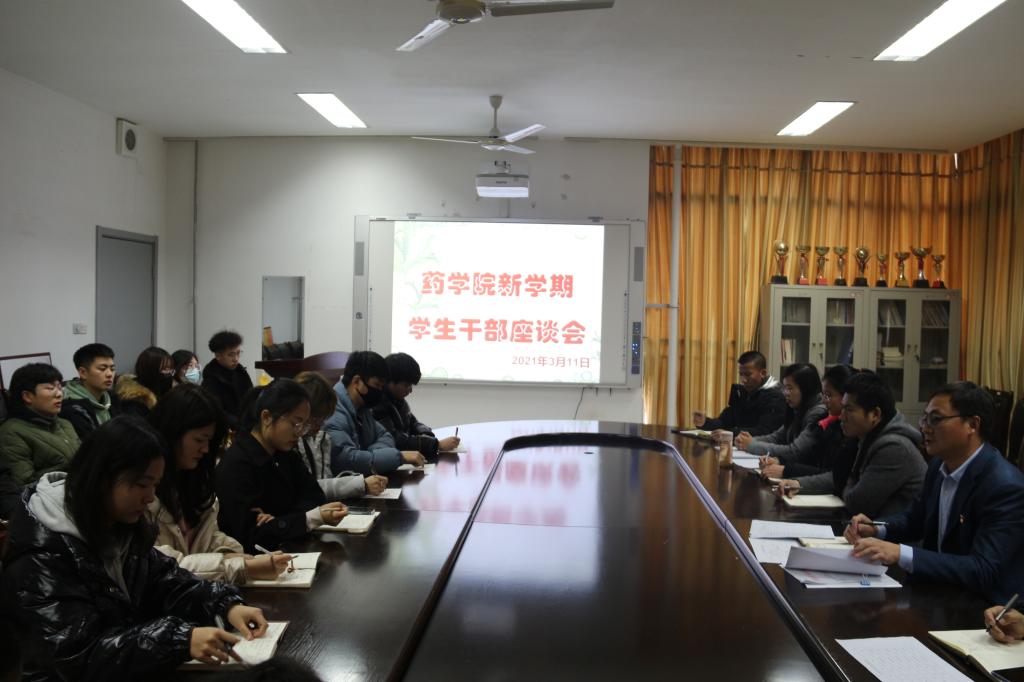 3月11日下午,药学院在学院会议室召开新学期学生干部座谈会,会议由党委副书记宋洪涛主持,全体辅导员及学生干部代表参加了本次座谈会。