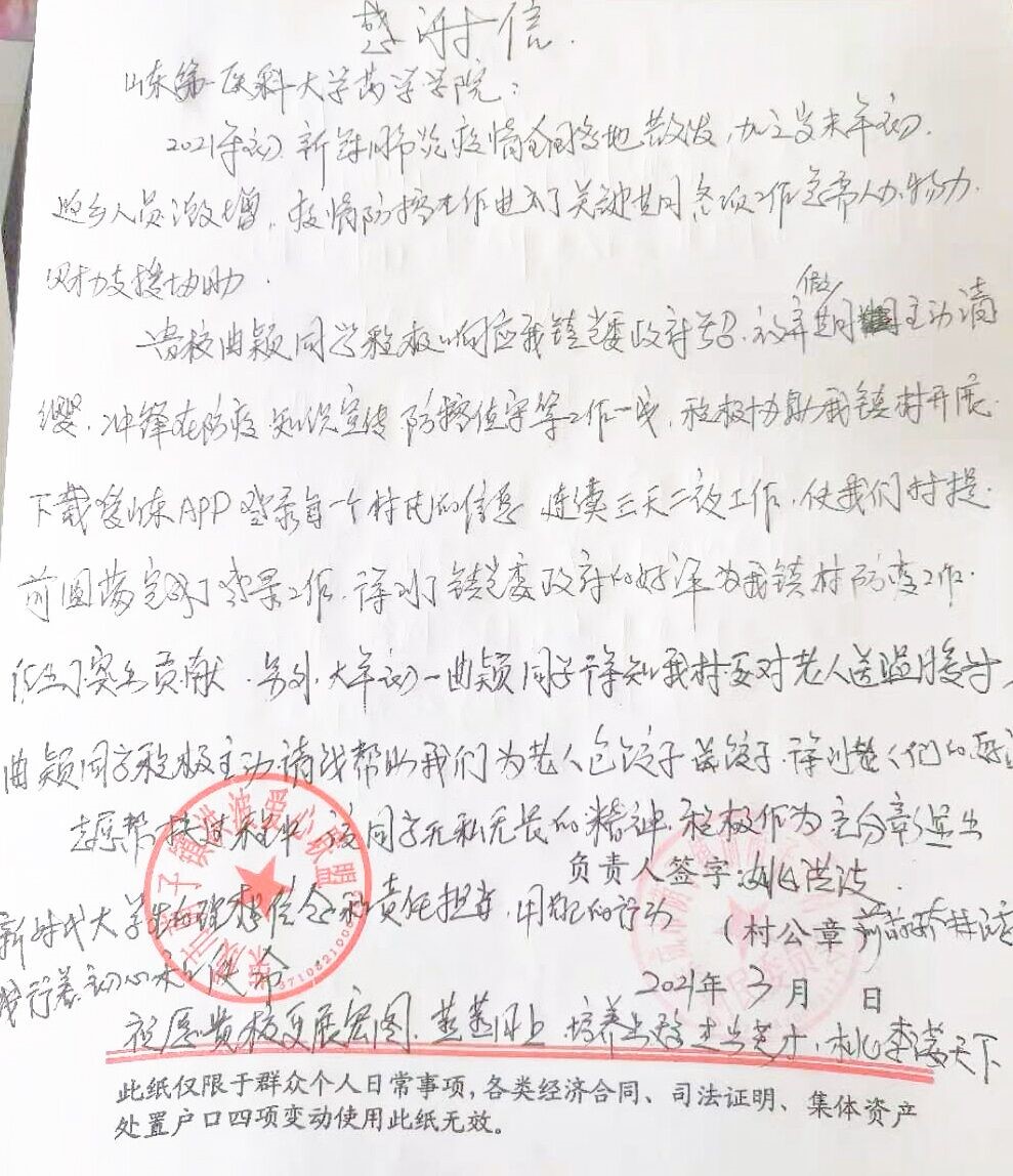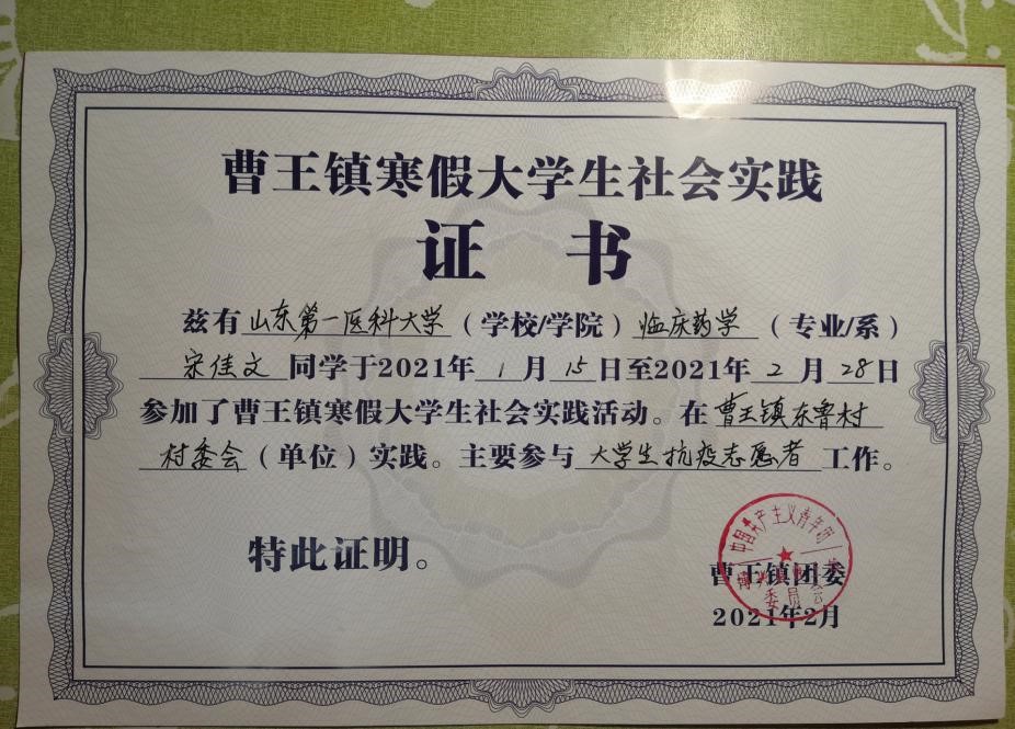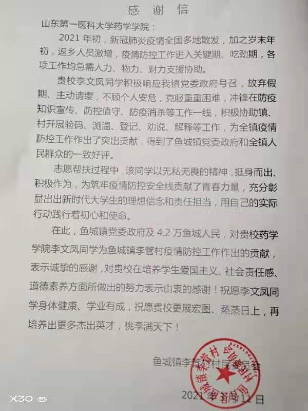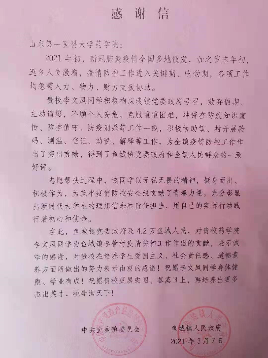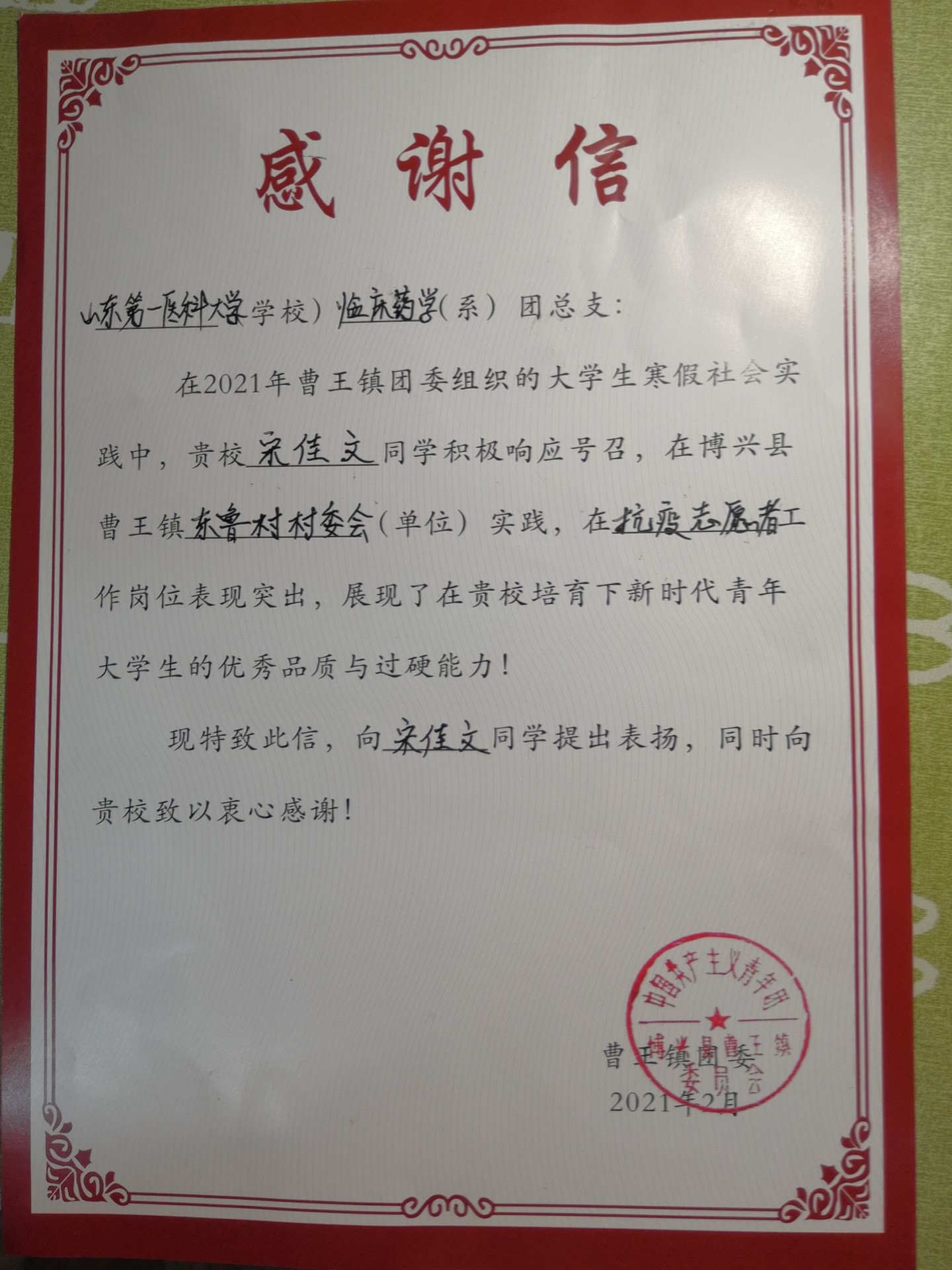 为了弘扬伟大的抗疫精神,进一步增强学生的疫情防控意识,药学院团总支在寒假期间下发了《药学院2021年寒假大学生社会实践活动方案》,鼓励我院学生积极参与到疫情防控工作中,通过社会实践坚定理想信念、站稳人民立场、练就过硬本领、投身强国伟业,助力疫情防控工作,增强我院学生荣誉感和大学生社会责任感。在寒假社会实践中,共有五名学生受到当地镇政府或团委表彰,他们是:2018级临床药学本科2班宋佳文,2019级药学本科2班曲颖、李文凤,2020级临床药学本科1班张浩,2020级药学本科3班白玉洁。