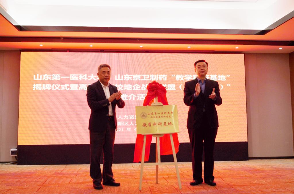 4月30日,山东京卫制药有限公司正式挂牌成为山东第一医科大学(山东省医学科学院)教学科研基地。山东第一医科大学(省医学科学院)党委委员、副(院)校长王鹏程,泰安市委组织部副部长、市人社局党组书记、局长蒋永斌,山东京卫制药有限公司总经理李铁军出席揭牌仪式。泰安高新区党工委委员,泰安高新建设集团有限公司董事长、党委书记律云彪主持揭牌仪式。