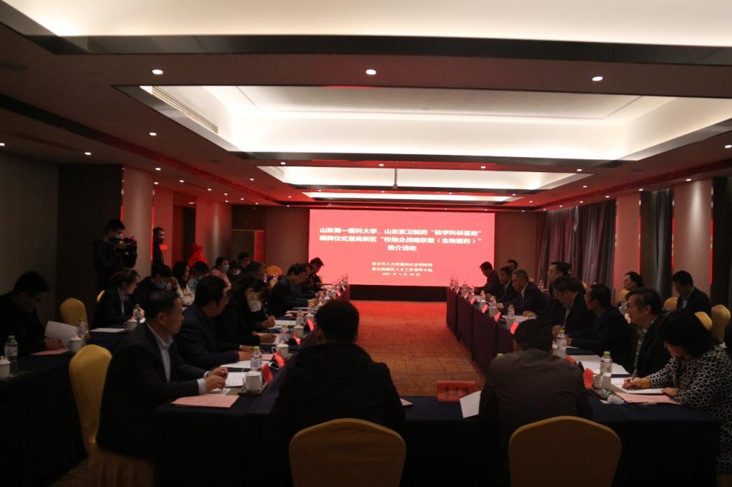 本次活动是深入贯彻泰安市委市政府产教融合、校企合作部署要求,充分利用校(院)的人才智力和山东京卫制药有限公司生产技术资源,本着校企互惠共赢原则,推进校、地、企三方建立战略联盟关系,推动高校院所与区内企业开展深度合作对接,更好地为企业培养所需人才,服务社会经济发展。药学院领导班子、山东京卫制药有限公司、部分驻泰高校、泰安市人社局、泰安高新区等单位和医药企业负责人参加活动。