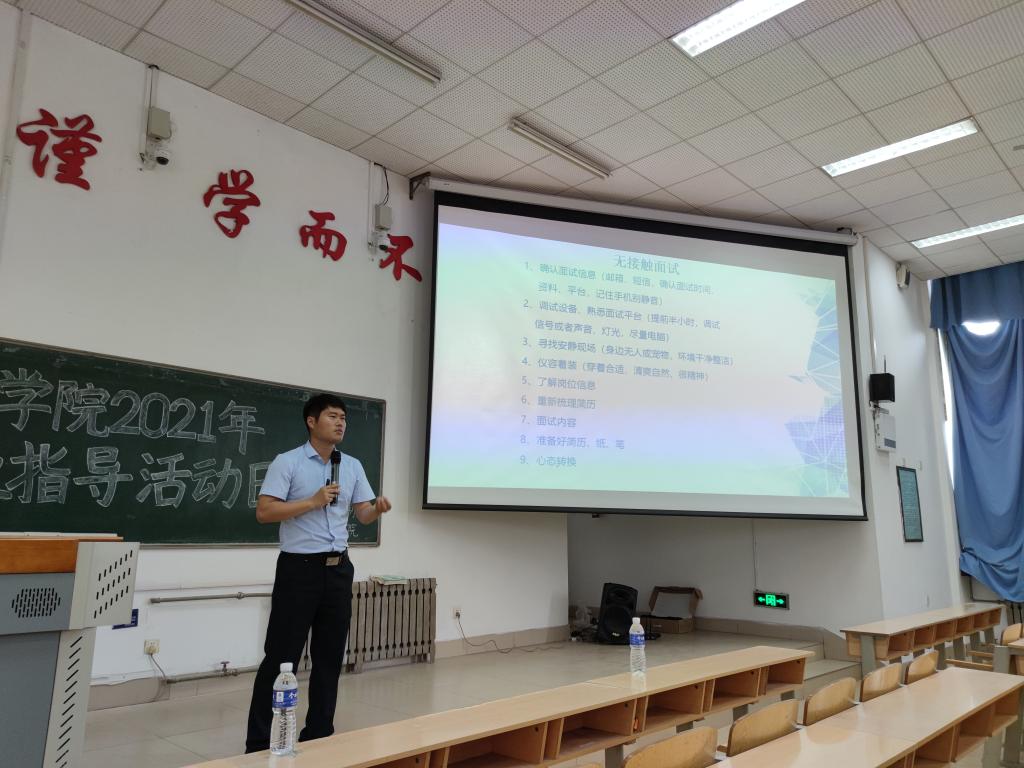 而后,郭永帅结合自身的工作经历和招聘工作经验,从行业分析、自我认知、求职方式、求职准备、面试技巧等五个方面为同学们进行系统的就业指导。
