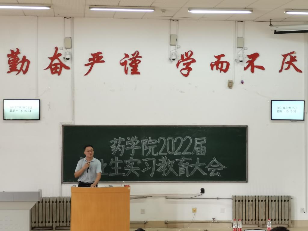 为进一步引导毕业生做好实习工作,推进实习工作的顺利开展,6月25日、7月5日,药学院分别开展2022届毕业生实习教育大会。会议由药学院党委副书记宋洪涛主持,临床药学系副主任徐晓燕、毕业生辅导员贾伍员和2022届全体本科毕业生参加教育大会。