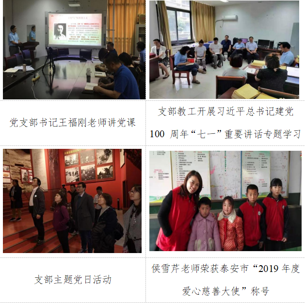 支部书记切实履行党建第一责任人职责,按照民主集中制原则,全体党员紧密配合,形成了团结、务实、民主的氛围。一是书记带头学习宣讲党的理论知识。支部书记、副书记带头上专题党课十余次,主要宣讲内容包括习近平新时代中国特色社会主义思想、新形势下党内政治生活的若干准则、中国共产党党史、十九大报告等。二是党员带头走出办公室,走向教学生活一线。各位党员深入教学一线,对教师进行诊断教学,多次召开师生座谈会,听取师生对教育教学工作的意见和建议。多次进入社区宣传安全用药知识,2019年党支部1人荣获泰安市“优秀慈善事业先进个人”称号。