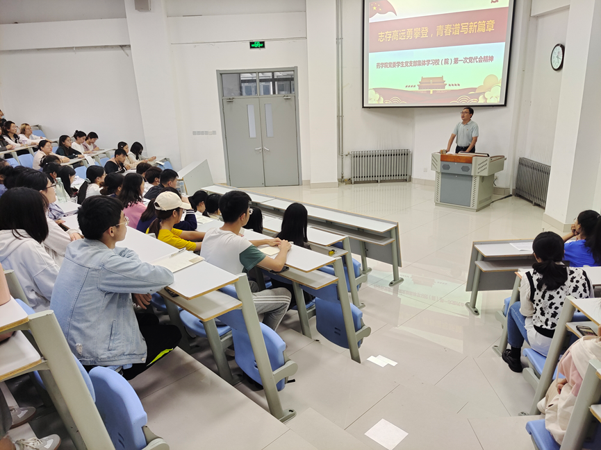 9月27日下午,药学院党委学生党支部在医学综合实验楼A132教室集体学习校(院)第一次党代会精神,学院党委副书记宋洪涛、辅导员和全体学生党员、部分入党积极分子参加学习。
