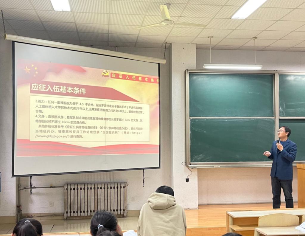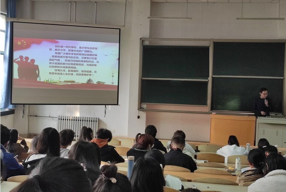 接着,宋洪涛从四个方面向同学们介绍了2021年大学生征兵工作的相关内容:第一从年龄、身体素质、政治素质等方面介绍了应征入伍的基本条件;第二对报名、体检、政审及预征定兵时间安排情况向同学们进行了详细介绍,让同学们了解了报名参军的基本流程;第三方面,向大家介绍了服役制度及优待政策,涉及退役复学之后学费补偿、学籍保留及未来发展等重要问题;第四从参军入伍的政治账、经济账、前途帐、素质帐、人脉帐这五笔帐向同学们介绍了参军入伍的优惠条件。他的详细讲解为怀揣着从军报国理想的有志青年提供了参考依据和便利途径。