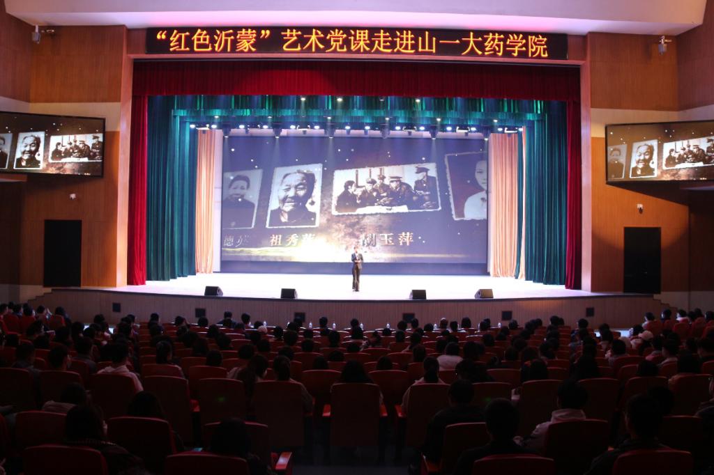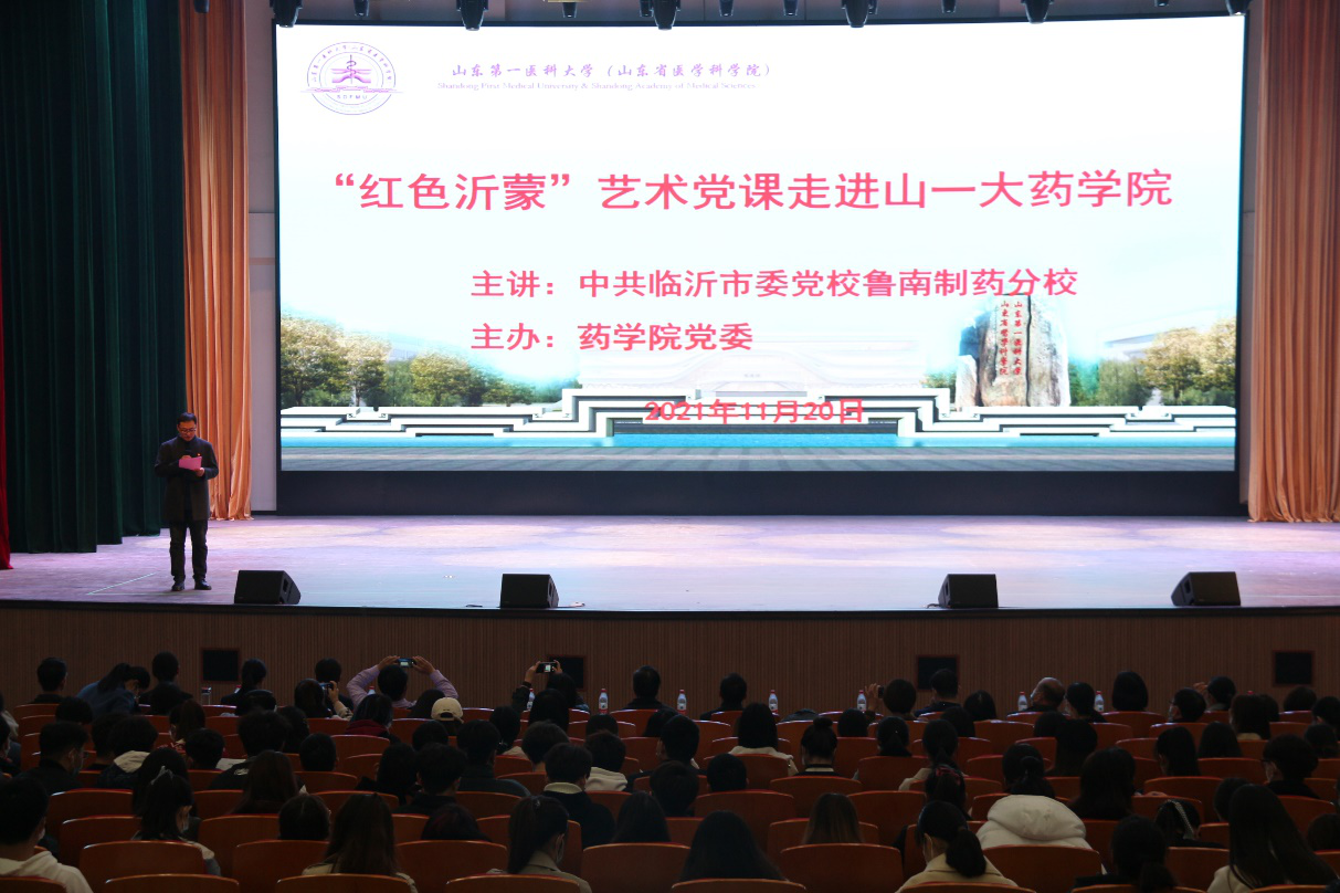 为深入开展党史学习教育,丰富学习形式,赓续红色基因,勇担时代重任,弘扬传承“沂蒙精神”,学习时代楷模赵志全等优秀共产党员的先进事迹。11月20日,药学院党委主办的“红色沂蒙”艺术党课走进山一大药学院活动在长城路校区大学生活动中心成功举办。本次党课由中共临沂市委党校鲁南制药分校担任主讲,药学院党委副书记宋洪涛主持。鲁南制药集团劳动人事部经理郭永帅,药学院党委书记史仁玖,副院长段桂运、周延萌和全体教工党员、学生党员、入党积极分子和部分学生代表参加活动。