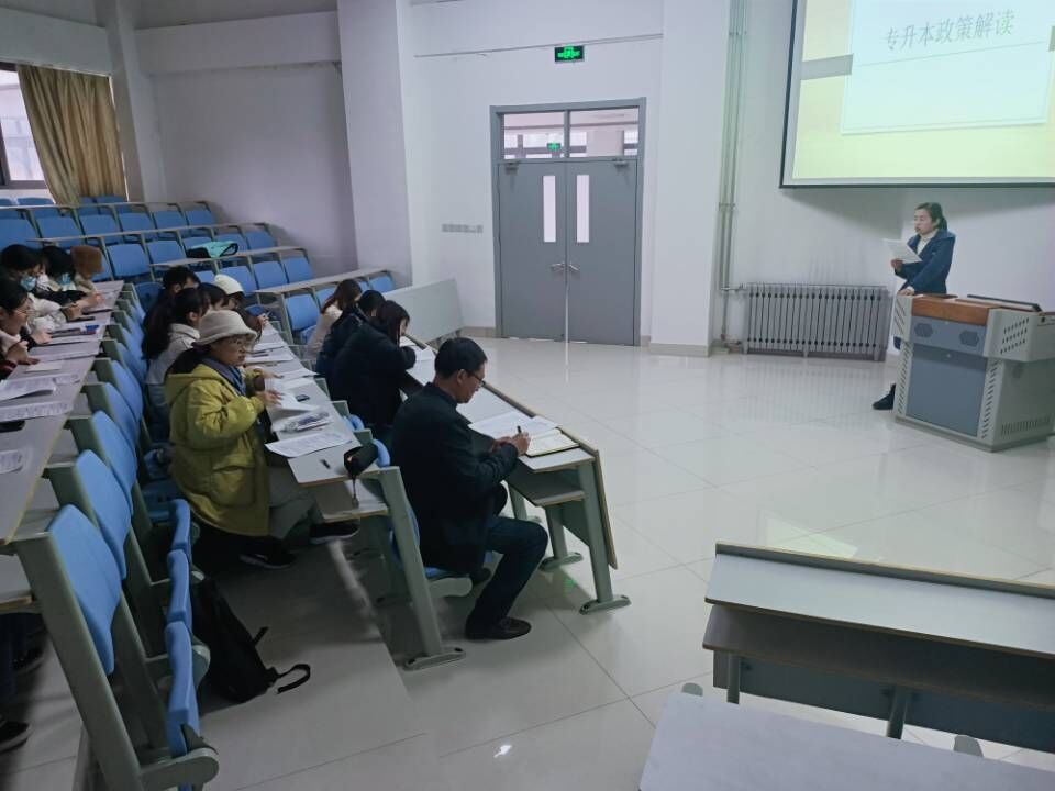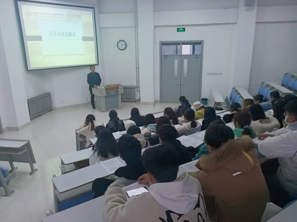 为全面做好我院2022年专升本工作,落实山东省教育厅、山东省退役军人事务厅《关于做好2022年普通高等教育专科升本科考试招生工作的通知》,传达校(院)2022年专升本考试招生工作会议精神,1月12日下午,药学院在医学综合实验楼A132教室召开召开了专升本政策解读会,药学院党委副书记宋洪涛出席并讲话,辅导员叶彦艳主持会议,2019级药学专科全体同学参加会议。