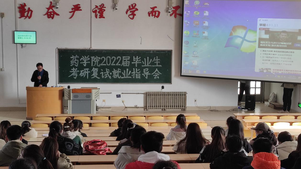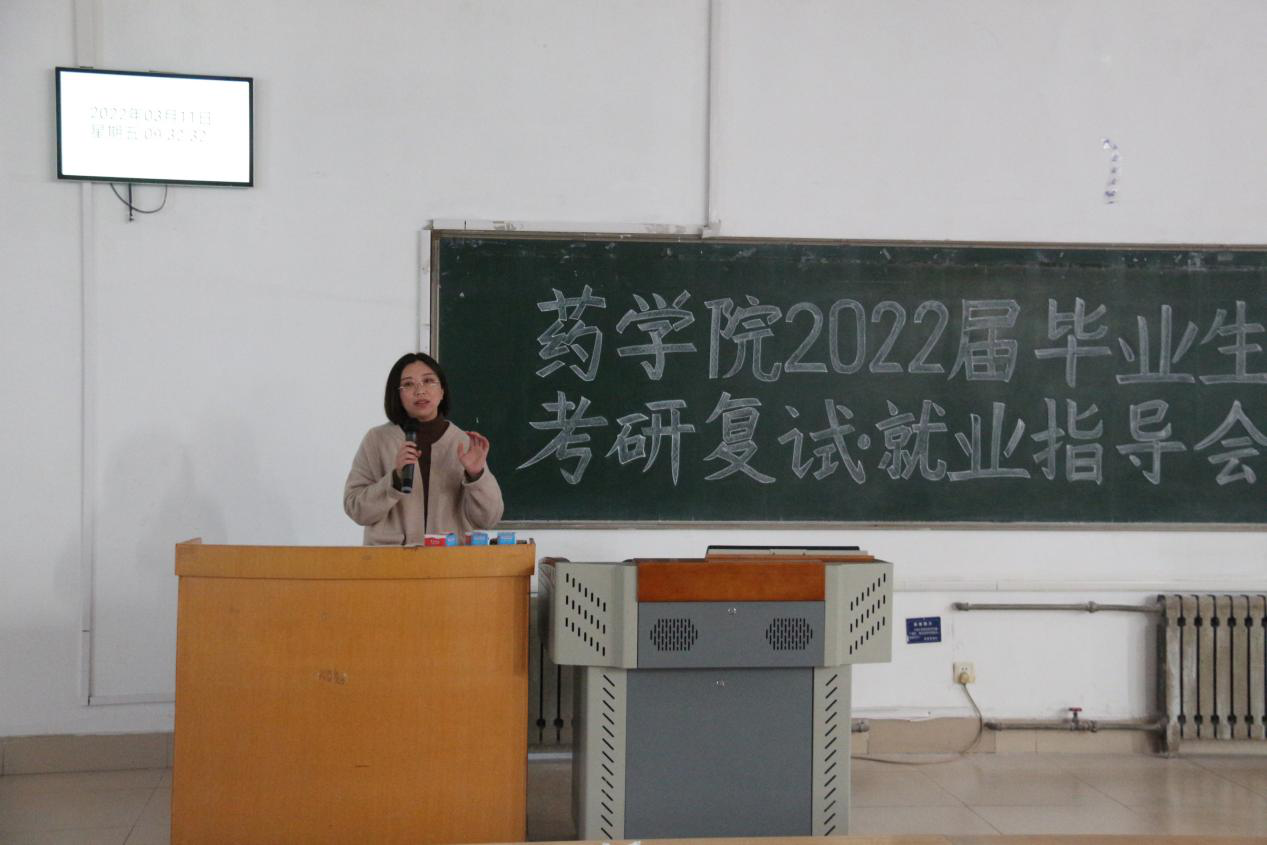 为进一步让毕业生了解当今严峻的就业形势,把握好就业机会,并引导通过国家线的考研学生积极投入到复试准备中,缓解考前心理焦虑。3月11日上午,药学院在教学南楼C1014教室召开了2022届毕业生考研复试、就业指导会,药学院副院长周延萌、党委副书记宋洪涛出席会议,年级主任贾伍员主持会议,在校内实习的240余名毕业生参加指导会。