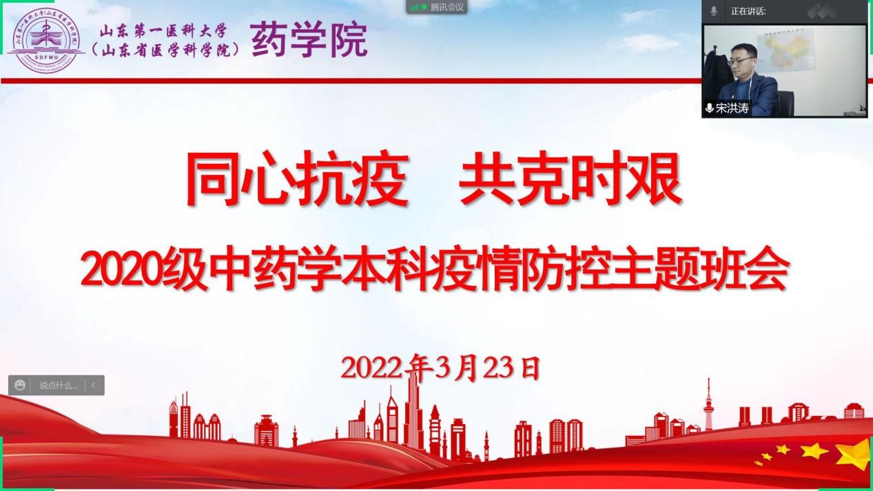 面对当前复杂严峻的疫情形势,为更好地保护好同学们的身体健康,落实泰安市和校(院)疫情防控的管理规定,药学院全面落实长城路校区闭环管理方案。3月21日—25日药学院全体辅导员召开线上疫情防控主题班会,号召全体学生“同心抗疫,共克时艰”。