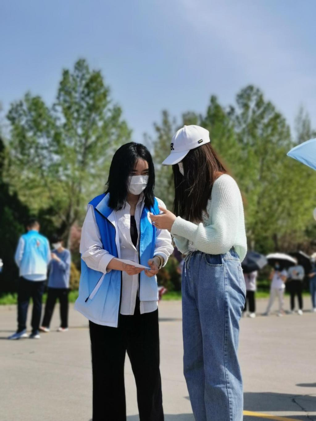 “首先我非常高兴能参与到这次抗疫志愿者服务中!虽然一开始我对于负责的工作不是很熟悉,但好在老师同学都耐心地为我答疑解惑。渐渐地,我对手头上的工作熟络了起来。虽然天气很热,但每一位志愿者都不畏烈日,没有一丝怨言,尽心尽力的为全校师生提供服务,同时我也感受到了奉献的魅力,领略到了志愿服务的精神内涵。”