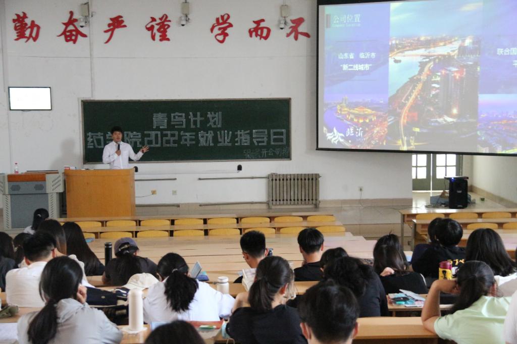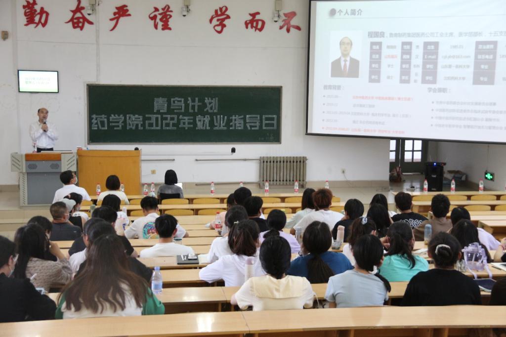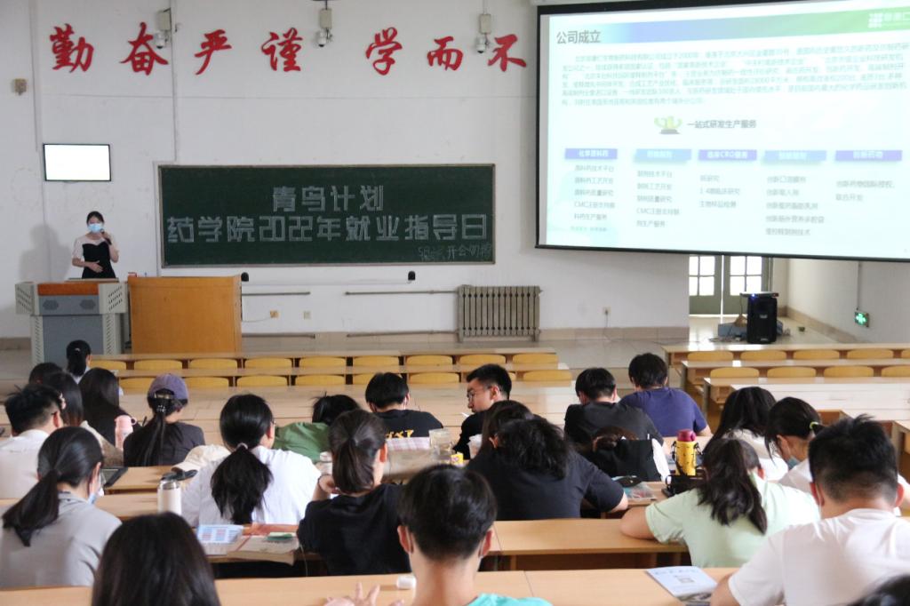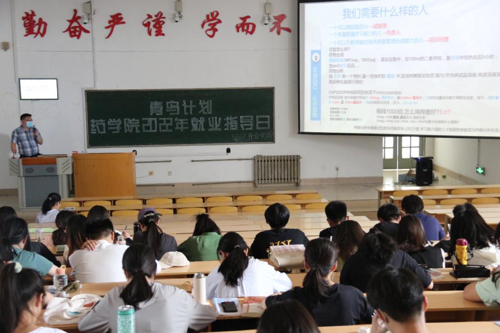 为贯彻落实校(院)招生就业工作会议精神,进一步推动我院本科毕业生就业工作,帮助毕业生了解就业形势,树立正确的就业择业观,提高就业能力,并深入了解企业文化,完善岗位认知。5月27–28日,药学院在长城路校区教学南楼C2017教室举办了“青鸟计划·药学院2022就业指导日活动”,邀请鲁南制药集团、山东创新药物研发有限公司、北京阜康仁生物制药科技有限公司、诺和诺德生物制药公司等4家企业工作人员给同学们上了一堂生动的就业指导课。药学院全体辅导员、2023届本科毕业生及未就业的2022届毕业生通过线上线下方式参加活动,活动由药学院党委副书记宋洪涛主持。