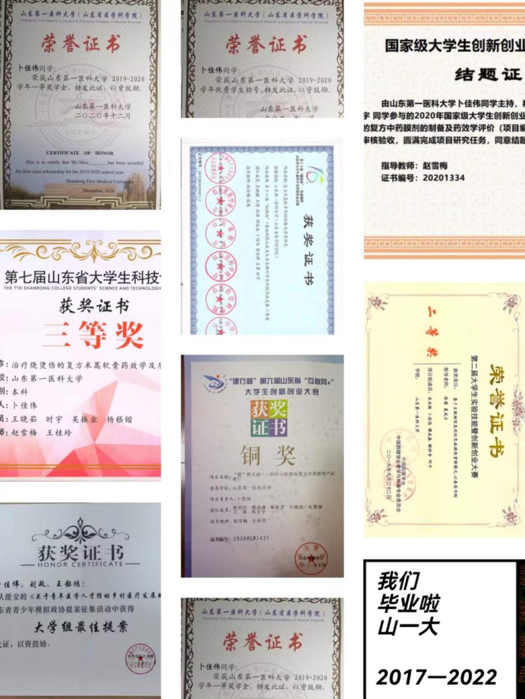 卜佳伟,2017级临床药学本科1班学生。中共党员、团支书,专业综合排名1/102,考研院校:山东大学临床药学专业。曾获省政府奖学金、国家励志奖学金、校级一等奖学金,获山东省优秀毕业生、山东省青少年模拟政协优秀学生、山一大“自强之星”、校级优秀学生干部、优秀学生等荣誉。