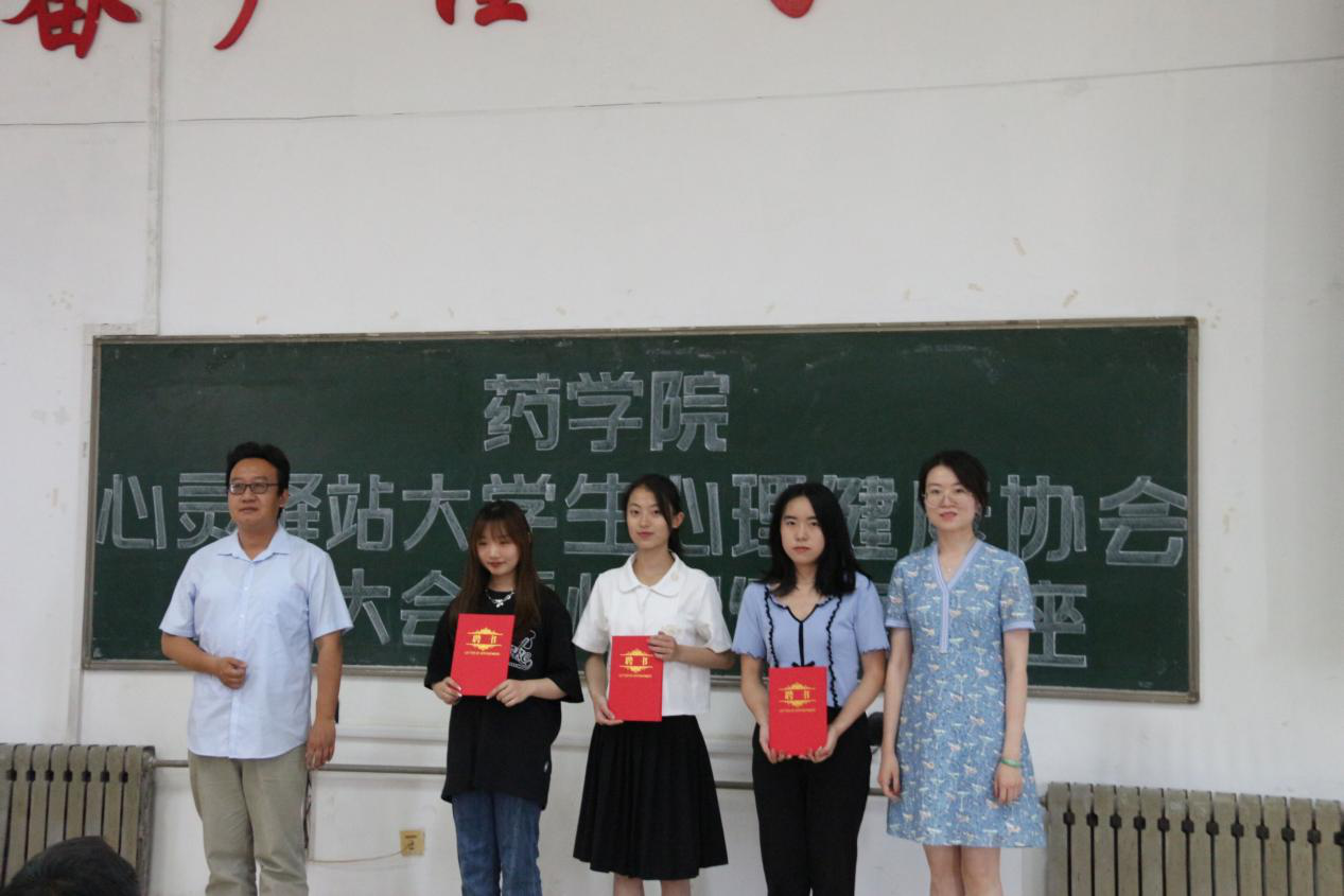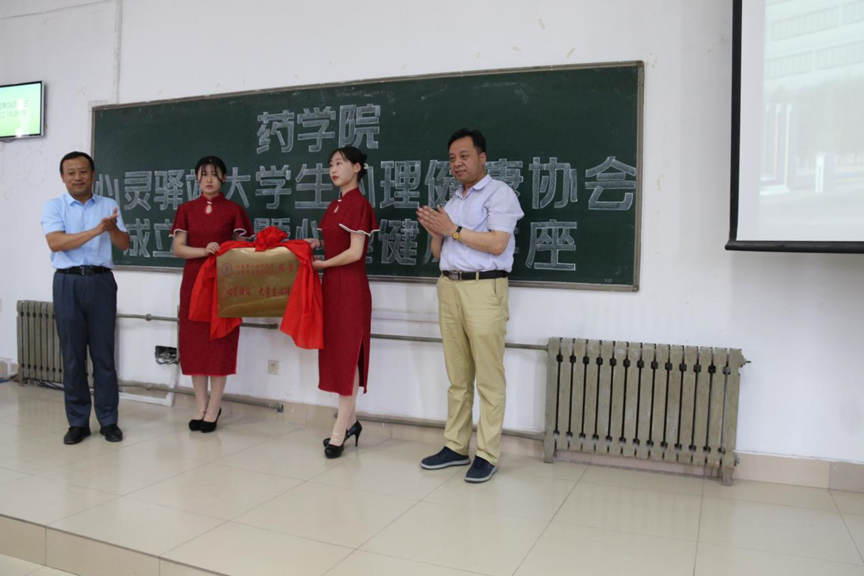 刘方永、史仁玖宣布药学院“心灵驿站”大学生心理协会成立并揭牌,为刘欣、叶彦艳颁发指导教师聘书。