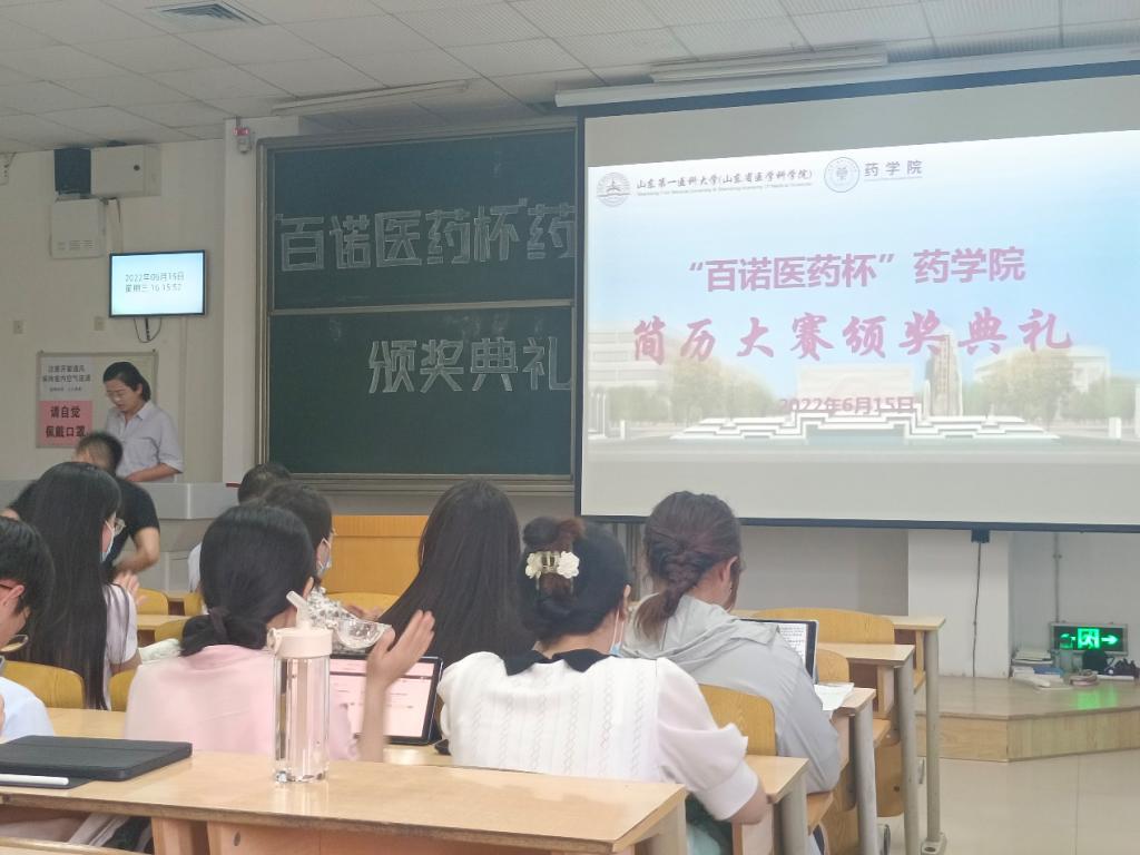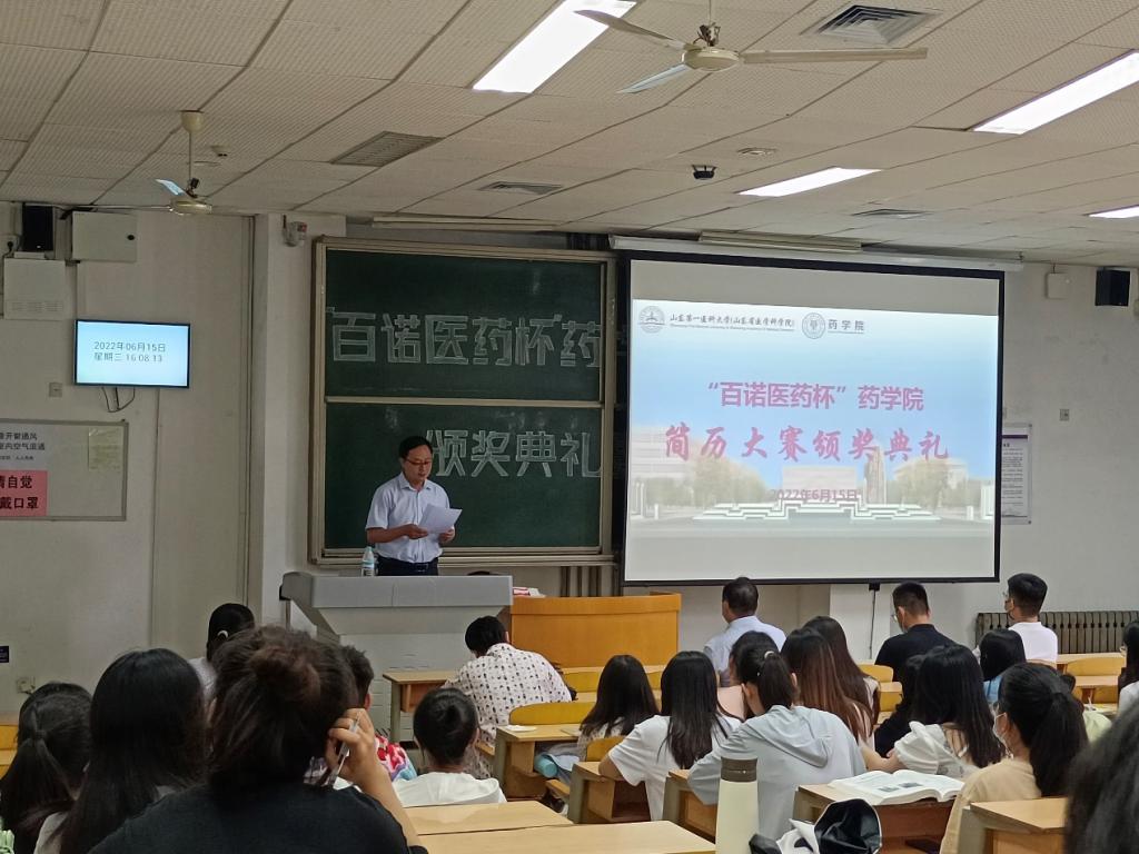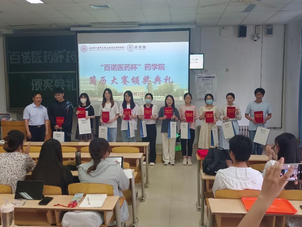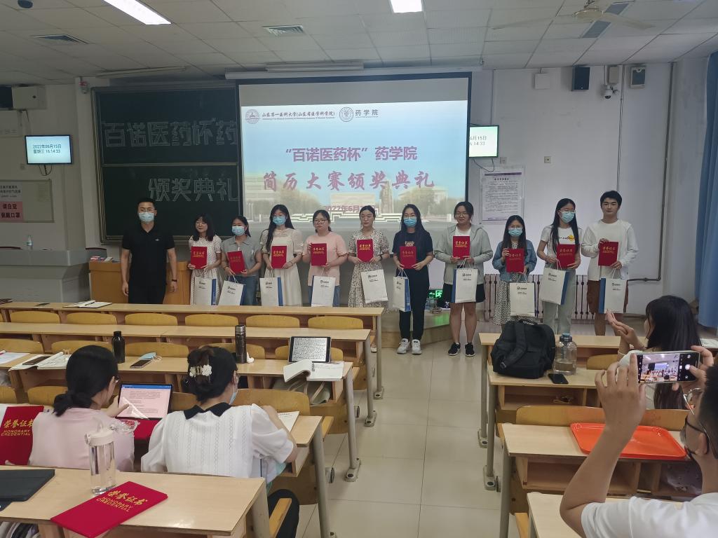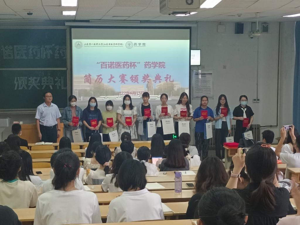 为帮助同学们了解当下严峻的就业形势、使其更好地认识自我、充分发挥个人知识储备和潜能,为将来的高质量就业打下良好的基础,药学院特联合山东百诺医药股份有限公司举办了“百诺医药杯”药学院求职简历设计大赛。活动通过学院网站和微信公众号进行广泛宣传,共有330余名学生参赛,经过1个月的撰写简历和评选。6月15日,药学院在教学南楼C1002教室举办“百诺医药杯”简历设计大赛颁奖仪式暨百诺医药宣讲会,百诺医药公司人力资源部经理田新宇、崔奇,药学院副院长段桂运、党委副书记宋洪涛,辅导员叶彦艳、冯春苗出席大会, 2019级学生参加大会。