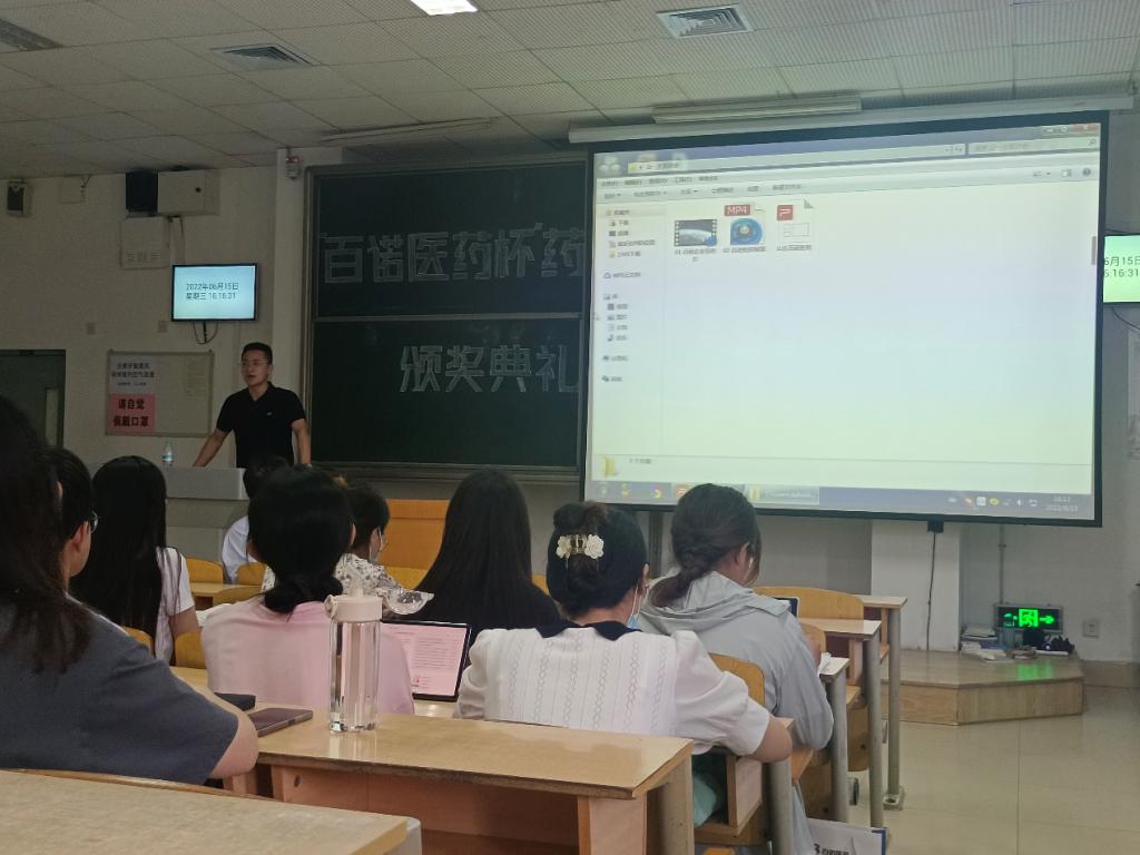 颁奖仪式结束后,田新宇为同学们进行企业宣讲,他详细介绍了百诺公司的企业概况、发展历程以及深厚的企业文化,令同学们印象深刻。对于同学们尤为关注的人才培养计划与丰厚的福利待遇,他也进行了详细说明,引起了同学们的热烈反响。田经理声情并茂的宣讲让同学们对百诺医药公司有了更为深入地了解,再次拓宽了药学院学子精准就业的良好平台。