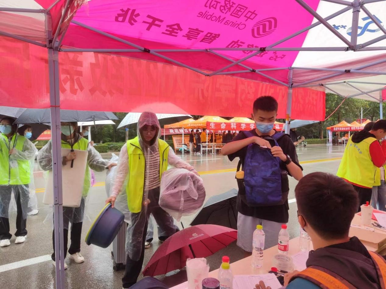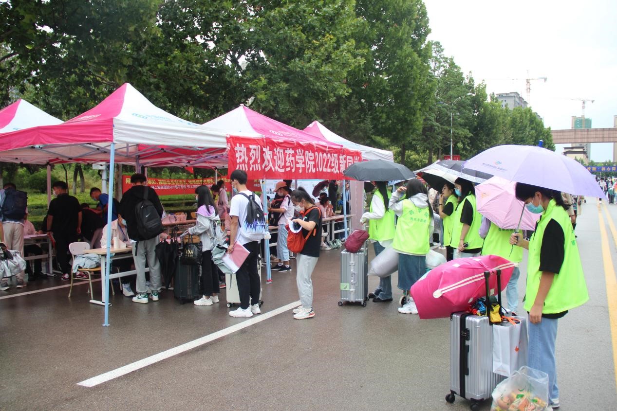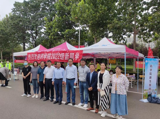 迎新过程中,校(院)领导和药学院莅临药学院新生报到现场,指导疫情防控和新生报到接待工作,为工作人员和志愿者们加油鼓劲,赞扬了志愿者们顶着恶劣天气服务同学的奉献精神,也为新生同学送去亲切关怀,保证了迎新工作的顺利开展。