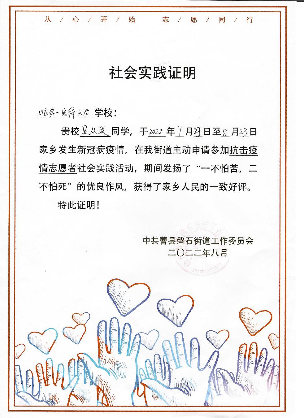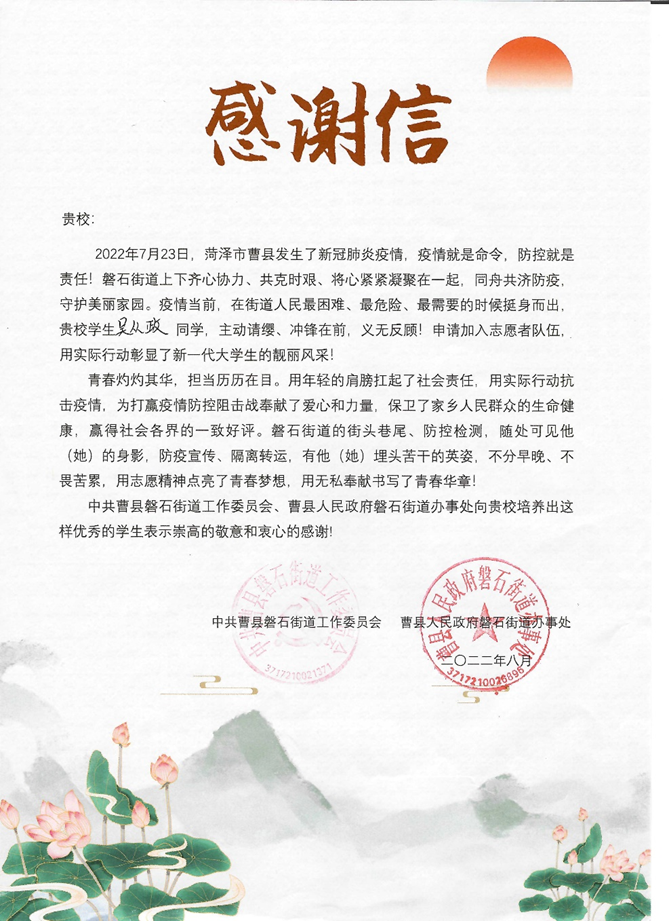 近日,药学院收到来自中共曹县磐石街道工作委员会和曹县磐石街道办事处寄来的感谢信,对药学院2022级药学本科1班新生吴从政在暑假期间积极参与疫情防控志愿服务表示衷心的感谢。