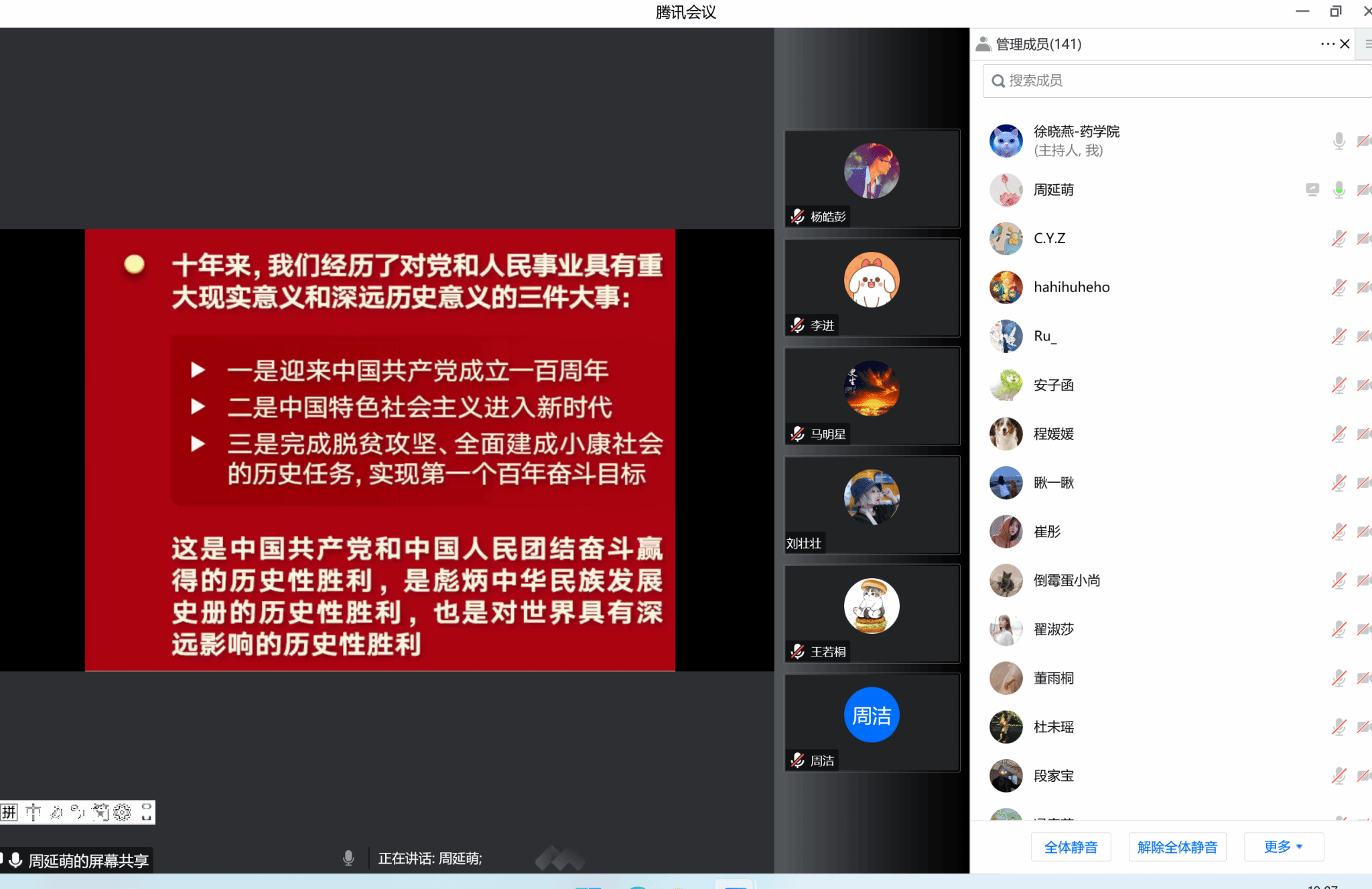 药学院副院长周延萌带领大家概况性的学习了党的二十大精神,使学生们认识到全面建成社会主义现代化强国总的战略安排和未来五年的主要目标任务,及“坚持和加强党的全面领导”“坚持中国特色社会主义道路”“坚持以人民为中心的发展思想”“坚持深化改革开放”“坚持发扬斗争精神”的重大原则,将党的二十大精神植根于学生的心田,提高学生的责任和使命担当,努力学习,为推进社会主义现代化建设做贡献。