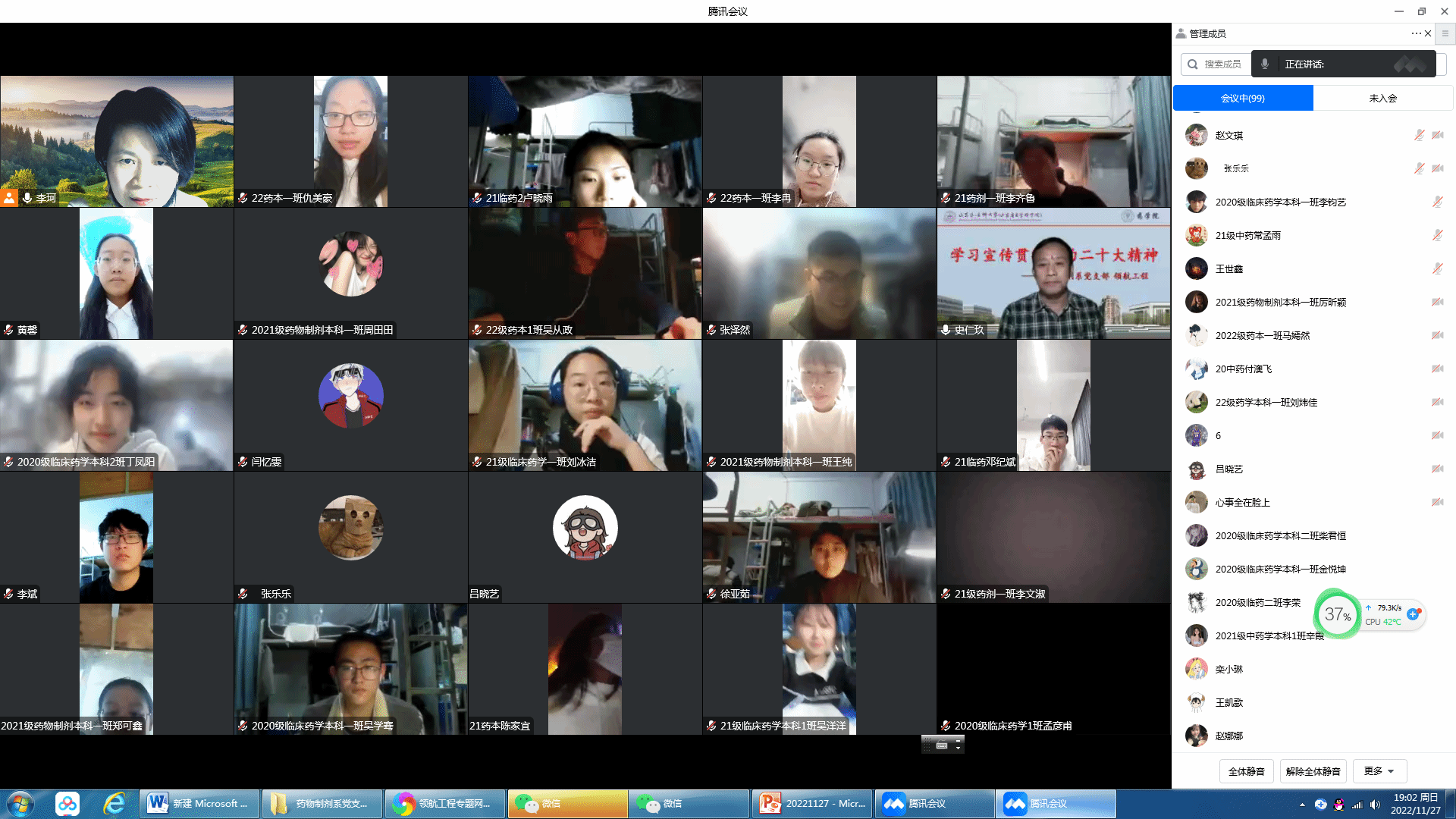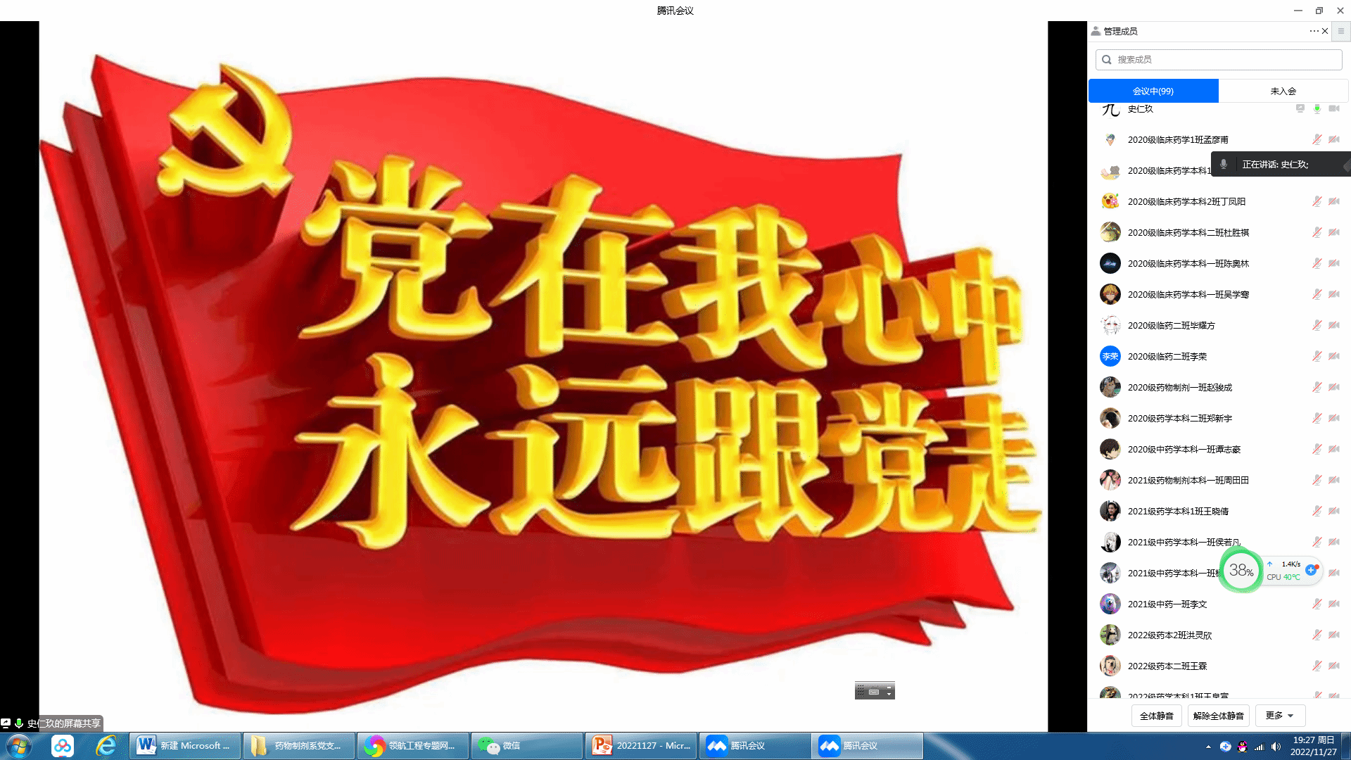 为进一步推动“领航工程”走深走实,切实做好学生们的领航员,助力班级进步、携手学子成长,11月27日晚,药物制剂系党支部与2022级药学本科专业1-2班学生共同开展了以“学习宣传党的二十大精神”为主题的“领航工程”云端交流会。交流会由党支部书记李珂主持。学院党委书记史仁玖作为普通党员参加会议并为学生宣传解读了党的二十大精神。
