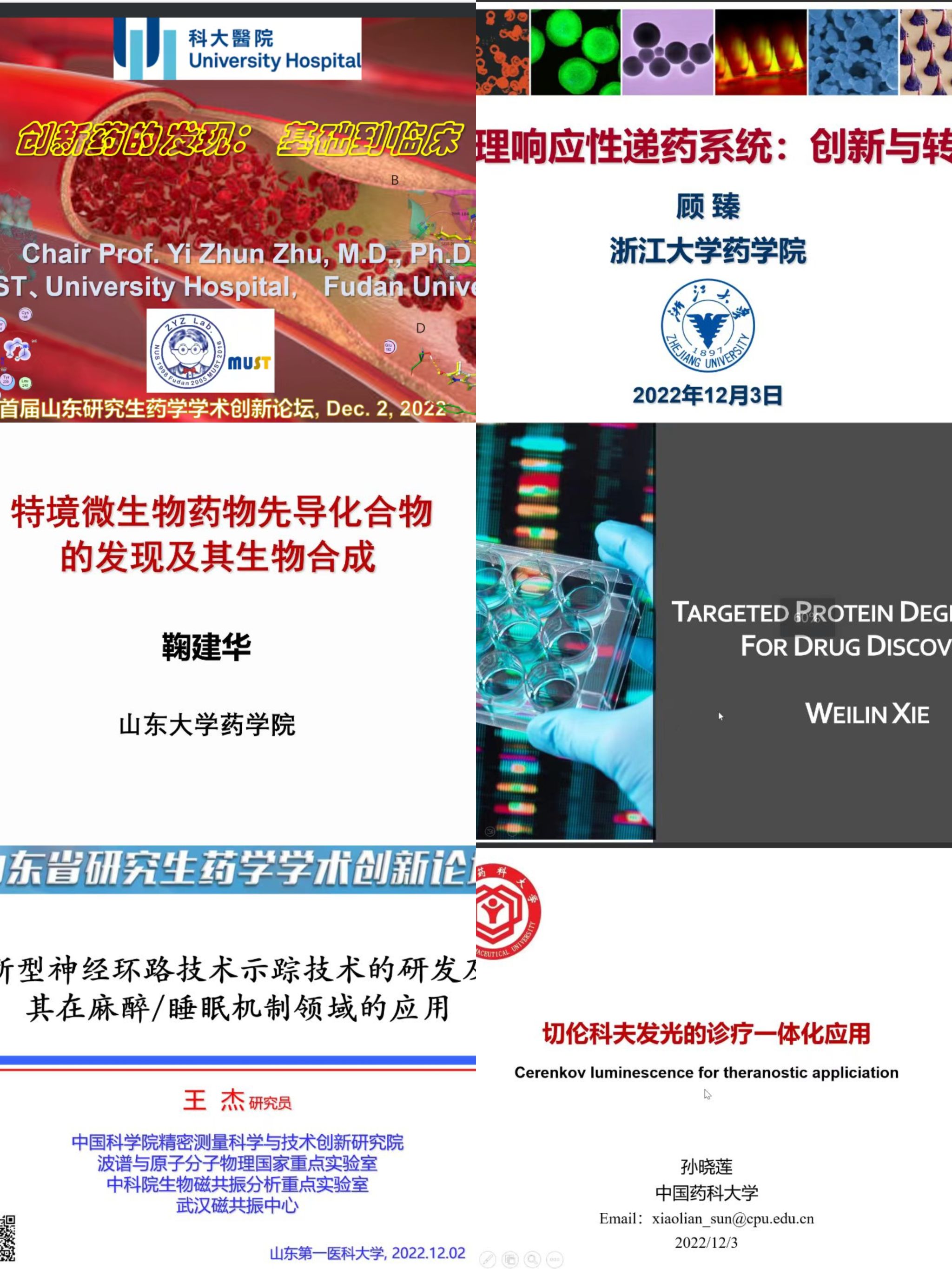 论坛邀请澳门科技大学副校长朱依谆教授、浙江大学药学院院长顾臻教授、山东大学药学院院长鞠建华教授、山东第一医科大学药学与制药科学学院院长解维林教授、中国科学院精密测量科学与技术创新研究院王杰研究员、中国药科大学孙晓莲教授作主旨报告。论坛主题涵盖创新药的发现、生理响应性递药系统、特殊生境微生物抗感染药物的研究开发、靶向蛋白质降解、新型神经环路示踪技术、放射性核素标记、切伦科夫发光的诊疗一体化应用等前沿科学问题。