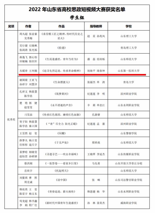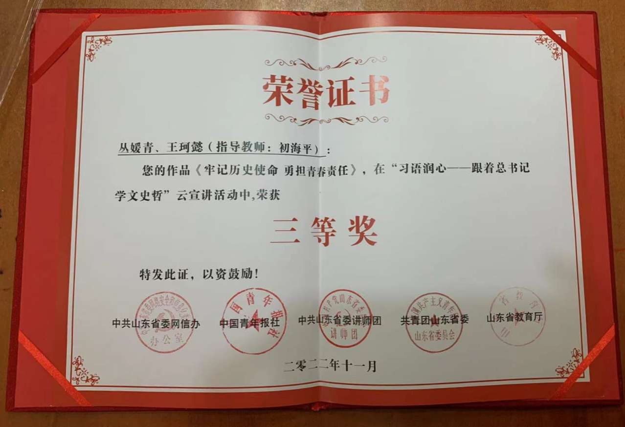 由中央网信办网络传播局指导,山东省委网信办、中国青年网联合主办的“习语润心——跟着习近平总书记学文史哲”云宣讲活动中,我院2020级丛媛青、王珂懿同学作品《牢记历史使命,勇担青春责任》获三等奖。山东省教育厅、大众报业集团联合主办的“青春向党,强国有我”2022年山东省高校思政短视频大赛,两位同学参赛作品《追寻先烈足迹,传承革命精神》再获优秀奖。
