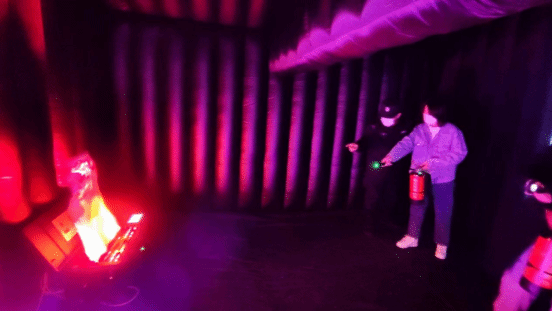 接下来,全体同学根据“一提二拔三展四压五瞄六射”动作要领,逐一操作干粉式灭火器灭火。模拟火灾现场,按照“低姿行、防温烟,摸壁板、慎判断,沿墙走、迷避免,口鼻掩、防浓烟;身体弯、保安全;探步前、避塌陷;标志看、朝疏散;出口观、待救援”,练习逃生技巧。