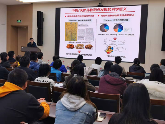 曾克武研究员是北京大学药学院博士生导师,教育部青年长江学者,长期致力于“中药及天然活性成分的作用靶点发现”,在PNAS等国际学术期刊发表研究论文60余篇,被基金委、科学网等报道,并入选“2017中国十大医学进展”。本次讲座,曾克武研究员系统介绍了中药活性成分独特的药理作用、天然产物活性分子的直接作用靶点及其作用机制,重点介绍了其带领团队研究中药活性成分靶点时使用的靶点“钩钓”技术以及取得的成果。靶点“钩钓”技术,原理相当于“鱼钩钓鱼”,中药活性成分或天然活性分子相当于“鱼钩”,在其上连接分子探针及固相微球,从组织、器官的细胞裂解液中寻找、“钩钓”具有特定相互作用的靶蛋白,从而确定活性靶点。曾研究员还介绍了第2代中药靶点群鉴定技术,以及中药复杂成分的靶点群(靶标谱)的鉴定,提出了“中药化学生物学”概念--即以中药特色成分为探针工具,研究靶点蛋白生物学功能,探讨中药调控生命和疾病的科学本质,这一概念入选2019年重大科学问题和工程技术难题。
