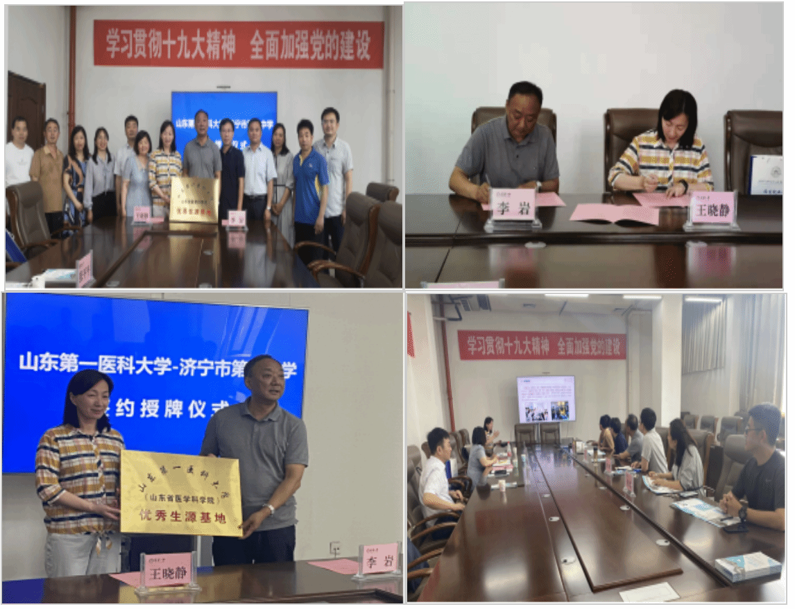 6月23日,山东第一医科大学(山东省医学科学院)药学与制药科学学院常务副院长王晓静、副院长牟艳玲、专业负责人杜成林、青年教师张平平一行四人,前往山东省济宁市第一中学访问交流,双方签署了优秀生源基地协议,并举行了优秀生源基地授牌仪式。济宁一中校长李岩,教学处、党政办公室、高三年级负责同志及部分教师代表参加授牌仪式及讨论交流。