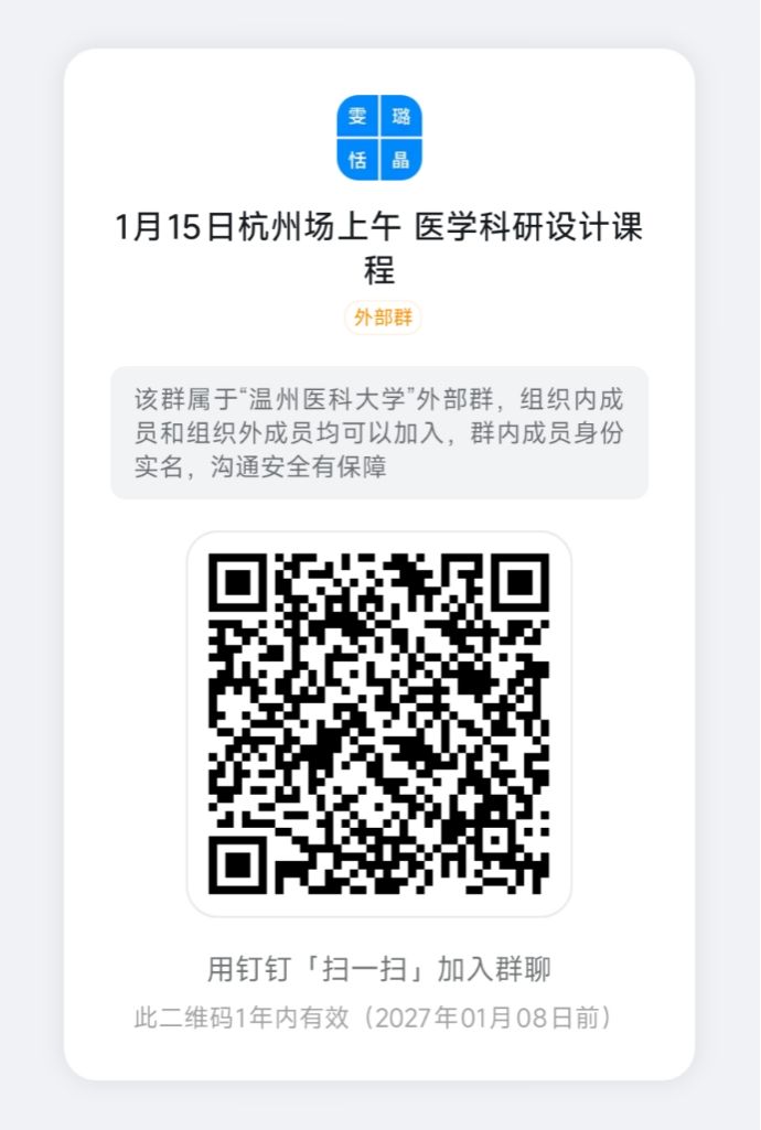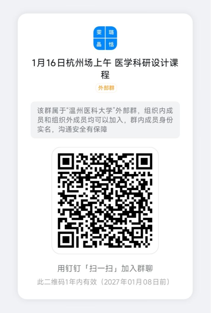 《医学科研设计与方法》课程将于1月15-16日(周四-周五)上课,本次课程地点为:杭州研究生培养基地浙江省人民医院朝晖院区(浙江省杭州市拱墅区上塘路158号)。会议议程每半天算一次博士课程,共两个半天,每位博士最多可参加两次。请参加会议的同学根据参课时间选择加入以下两个钉钉群