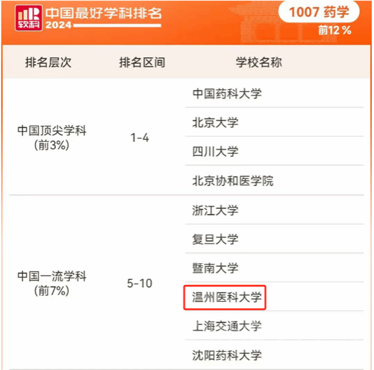 2024年10月15日,高等教育评价专业机构软科正式发布“2024中国最好学科排名”。我校药学学科跻身3%-7%区间,提升到前7%,全国排名第8,较2023年提高4个位次,学科水平和实力进入全国药学学科第一方阵。