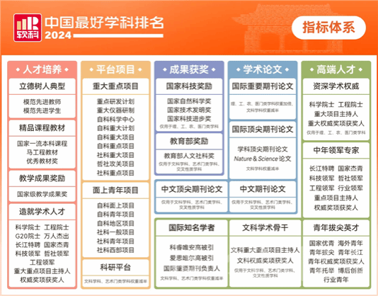 据悉,软科中国最好学科排名的指标体系包括人才培养、平台项目、成果获奖、学术论文、高端人才5个指标类别,下设18个指标,共计70余项反映学科竞争力的观测变量。排名数据全部来自第三方数据源,如教育部、科技部、国家自然科学基金委员会、国际和国内文献数据库等。学科排名全国前3%(或前2名)为“中国顶尖学科”,位列全国前7%(或前3名)和前12%(或前4名)为“中国一流学科”。