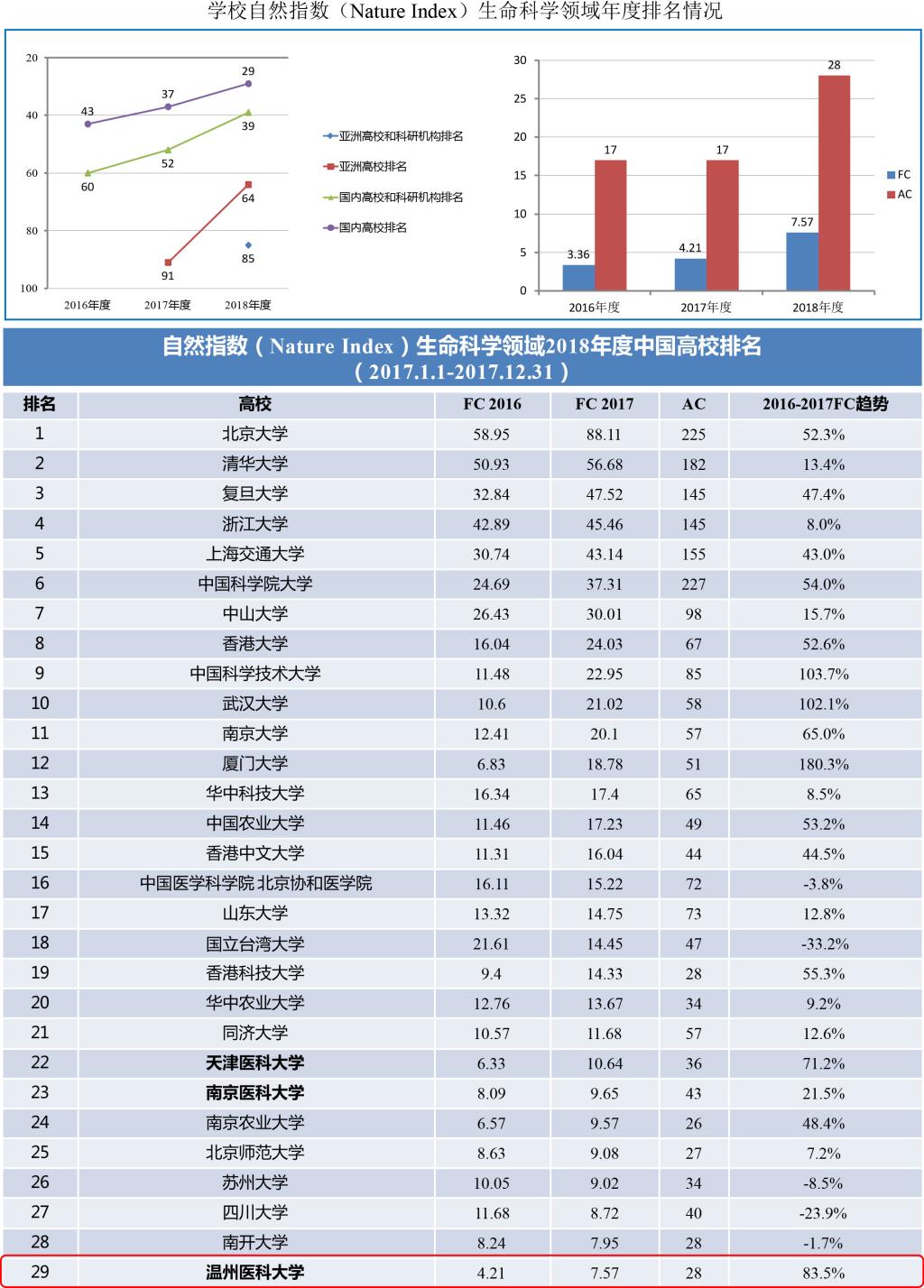 近日,2018自然指数年度榜单(Nature Index 2018 Annual Tables)正式发布,我校在生命科学领域排名首次进入亚洲高校和科研机构百强,位列第85位;在亚洲所有高校中排名跃升至第64位,在国内高校和省委部共建医学院校中分别位列第29位和第3位,同时位列浙江省属高校第一。