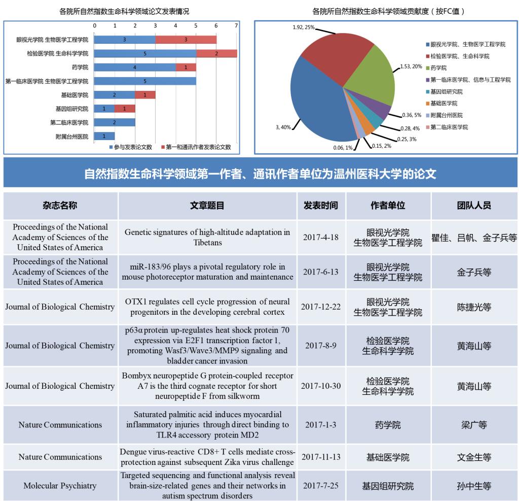 2017年1月1日至2017年12月31日,我校在自然指数相关期刊上共发表论文40篇,总FC值达到9.8,其中生命科学领域共发表论文28篇,总FC值为7.57(较上一年度上升83.5%)。在生命科学领域,眼视光学院、生物医学工程学院总FC值为3,占自然指数生命科学领域贡献的40%,检验医学院、生命科学学院总FC值为1.92,占自然指数生命科学领域贡献的25%;药学院总FC值为1.53,占自然指数生命科学领域贡献的20%。在发表的论文中,第一作者和通讯作者为我校的共有8篇,其中眼视光学院、生物医学工程学院发表3篇,检验医学院、生命科学学院发表2篇,药学院、基础医学院和基因组研究院各发表1篇。