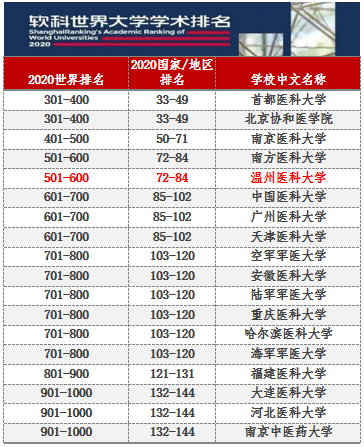 今天,全球领先的高等教育评价机构软科今日正式发布“2020软科世界大学学术排名”。排名展示了全球领先的1000所研究型大学,中国内地共有144所大学上榜,温州医科大学位居全球501-600区间,较去年上升100位次。