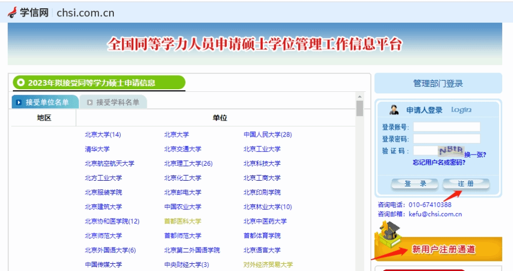 一、申请人登录https://tdxl.chsi.com.cn/tdxlsqxt/index.html网页后,进入“新用户注册通道”,用注册邮箱激活账号。请牢记用户名、密码,此用户名将作为申请人在“信息平台”的唯一凭证,用于绑定、查询统考成绩等。